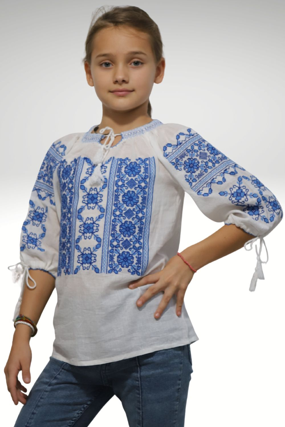 Ie tradiţională fete brodată la maşină;  culoarea broderiei este albastra; material pânză de bumbac.