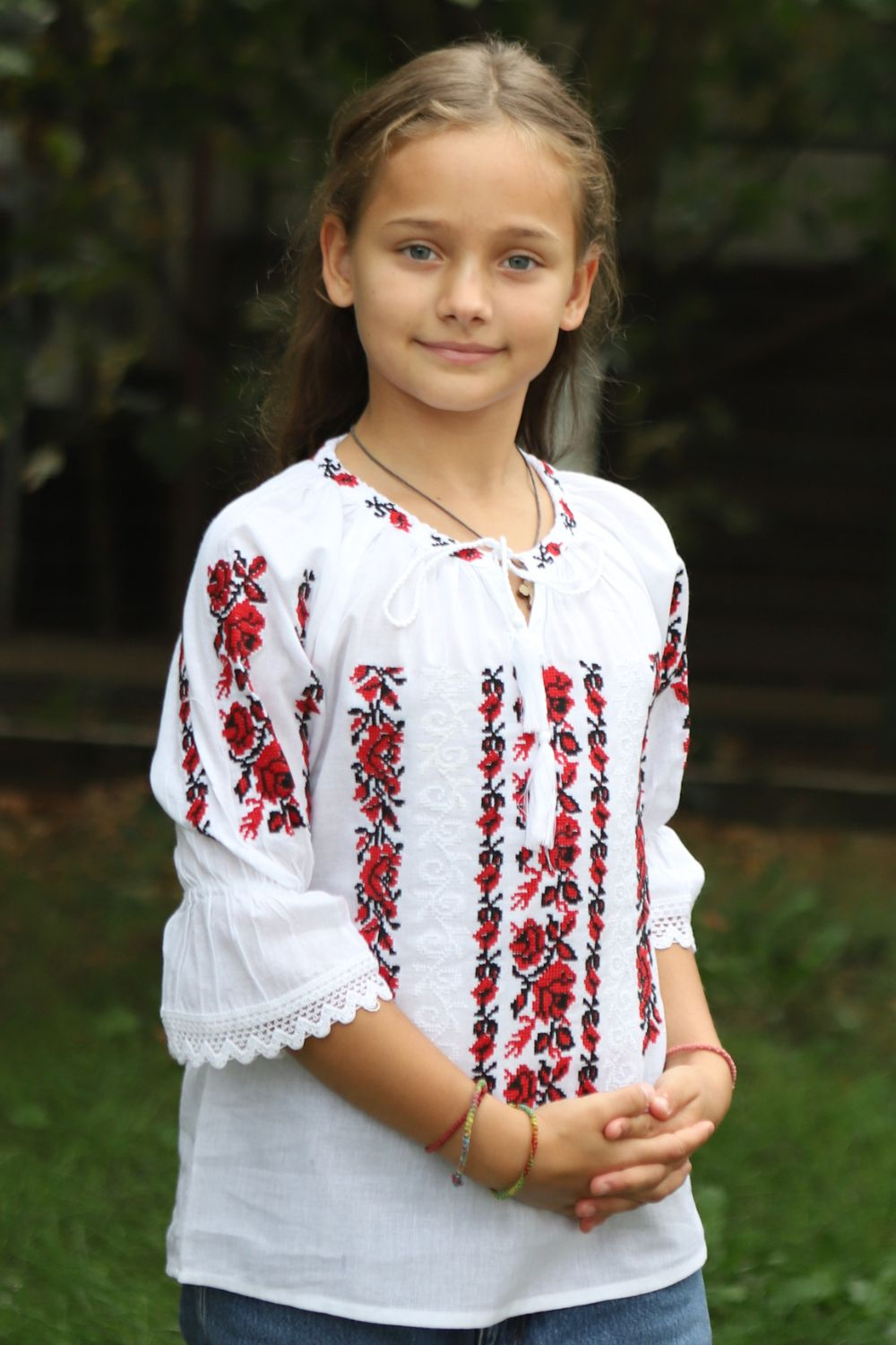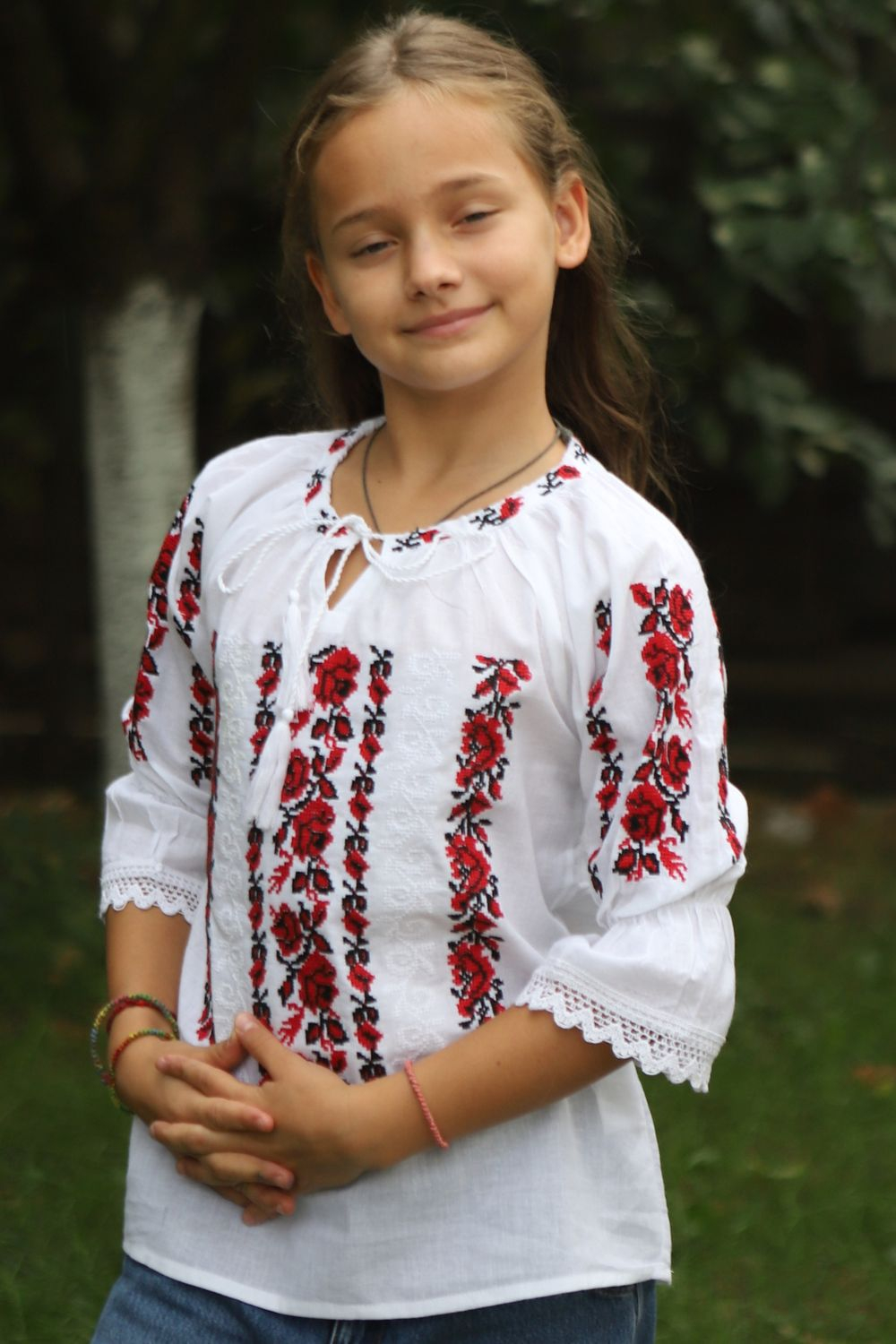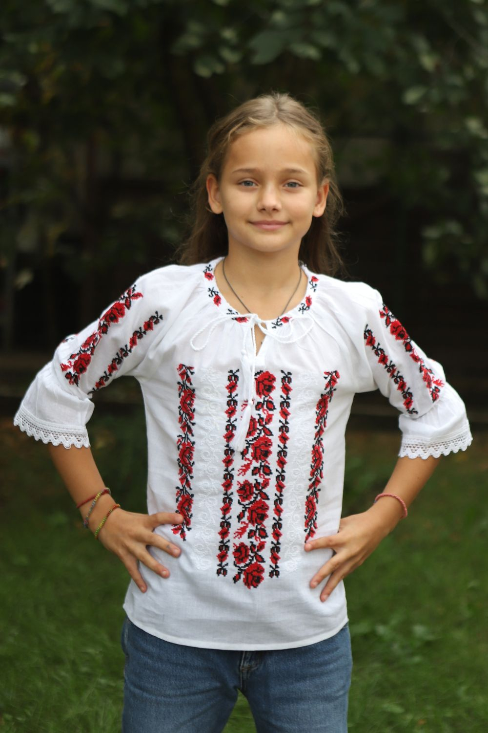 Ie tradiţională fete brodată la maşină;  culoarea broderiei rosie ; material pânză de bumbac.