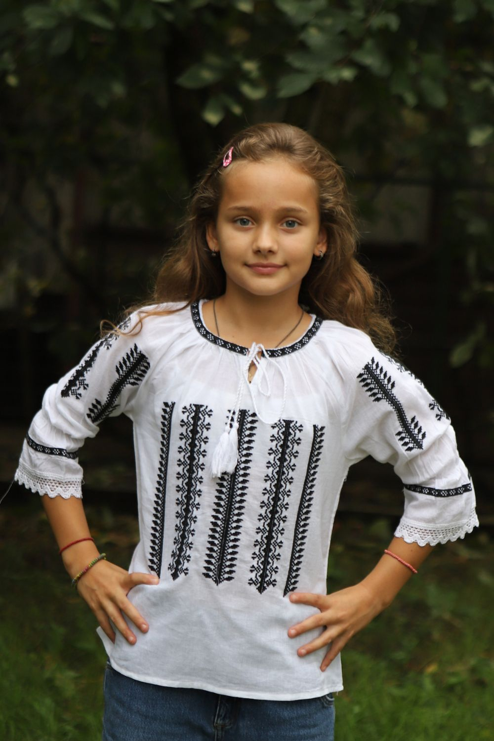 Ie tradiţională fete brodată la maşină;  culoarea broderiei neagra ; material pânză de bumbac.