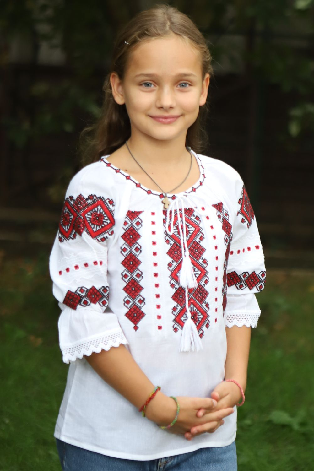 Ie tradiţională fete brodată la maşină;  culoarea broderiei rosie ; material pânză de bumbac.