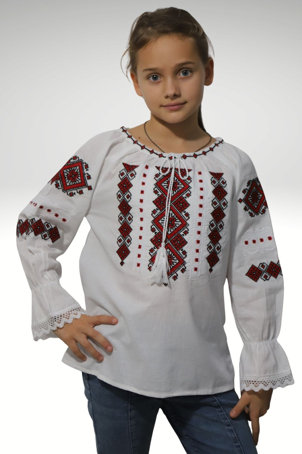Ie tradiţională fete brodată la maşină;  culoarea broderiei este rosie ; material pânză de bumbac.