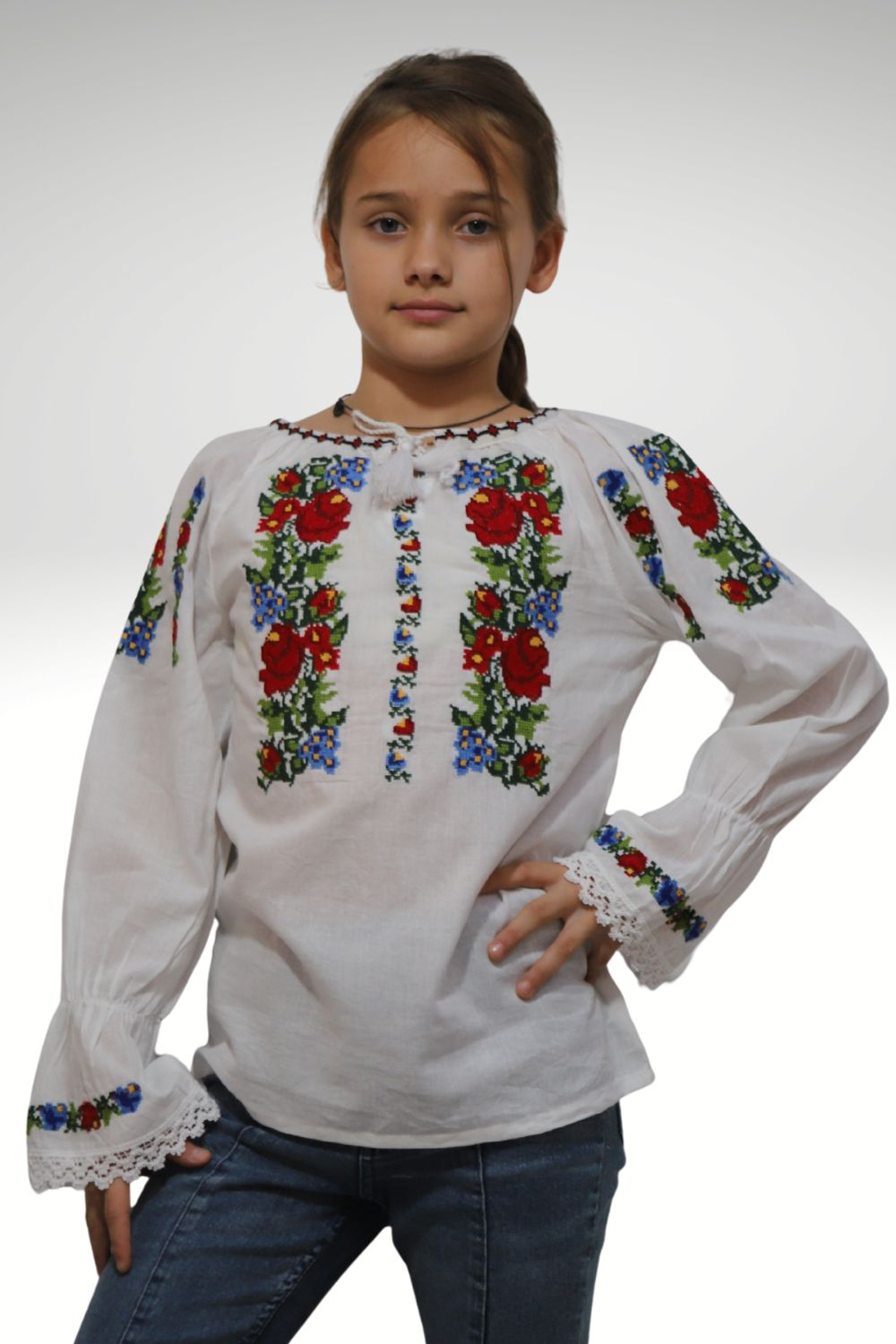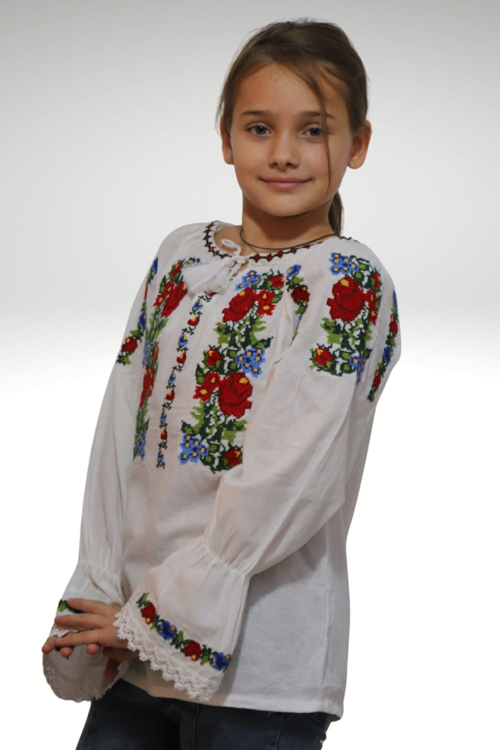 Ie tradiţională fete brodată la maşină;  culoarea broderiei este rosie; material pânză de bumbac.