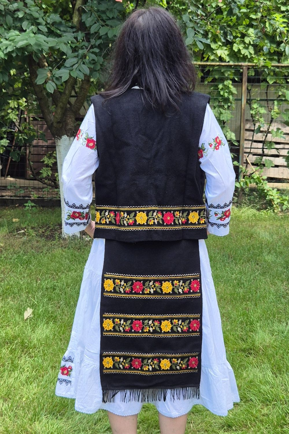 Compleu tradiţional damă compus din fotă și vestă, brodate la maşină;Materialul este din lana58%,polyester25%,acrylic8%,nylon7%,viscoza1%,bumbac1%.