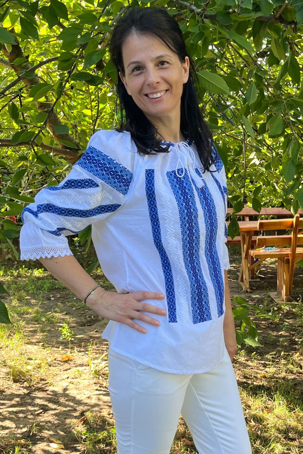 Materialul este panză de bumbac albă iar culoarea broderiei este albastră. Mâneca este 3/4 strânsă cu elastic și terminație evazată clopot cu dantela albă.
