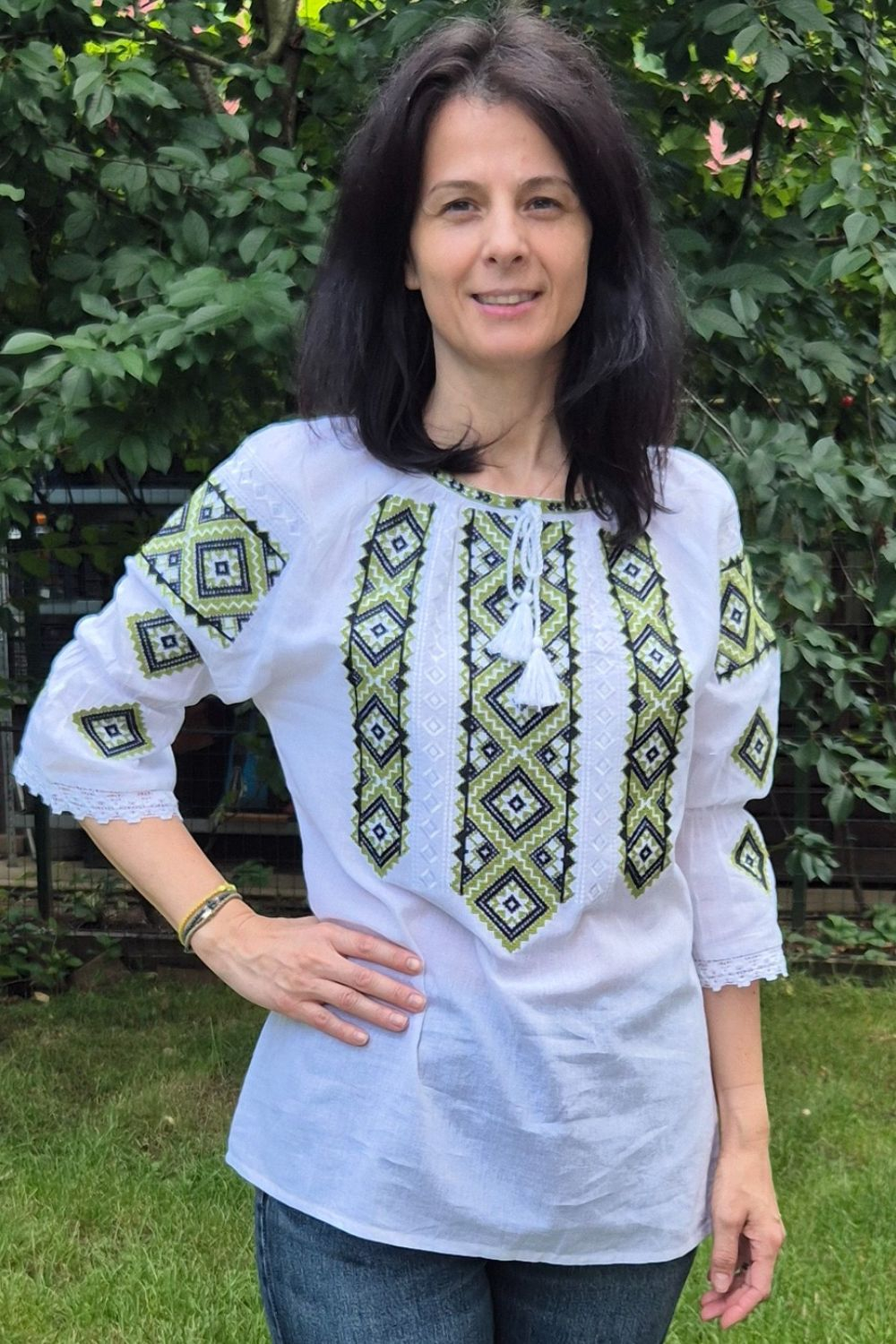 Materialul este panză de bumbac alba iar culoarea broderiei este verde . Mâneca este scurta