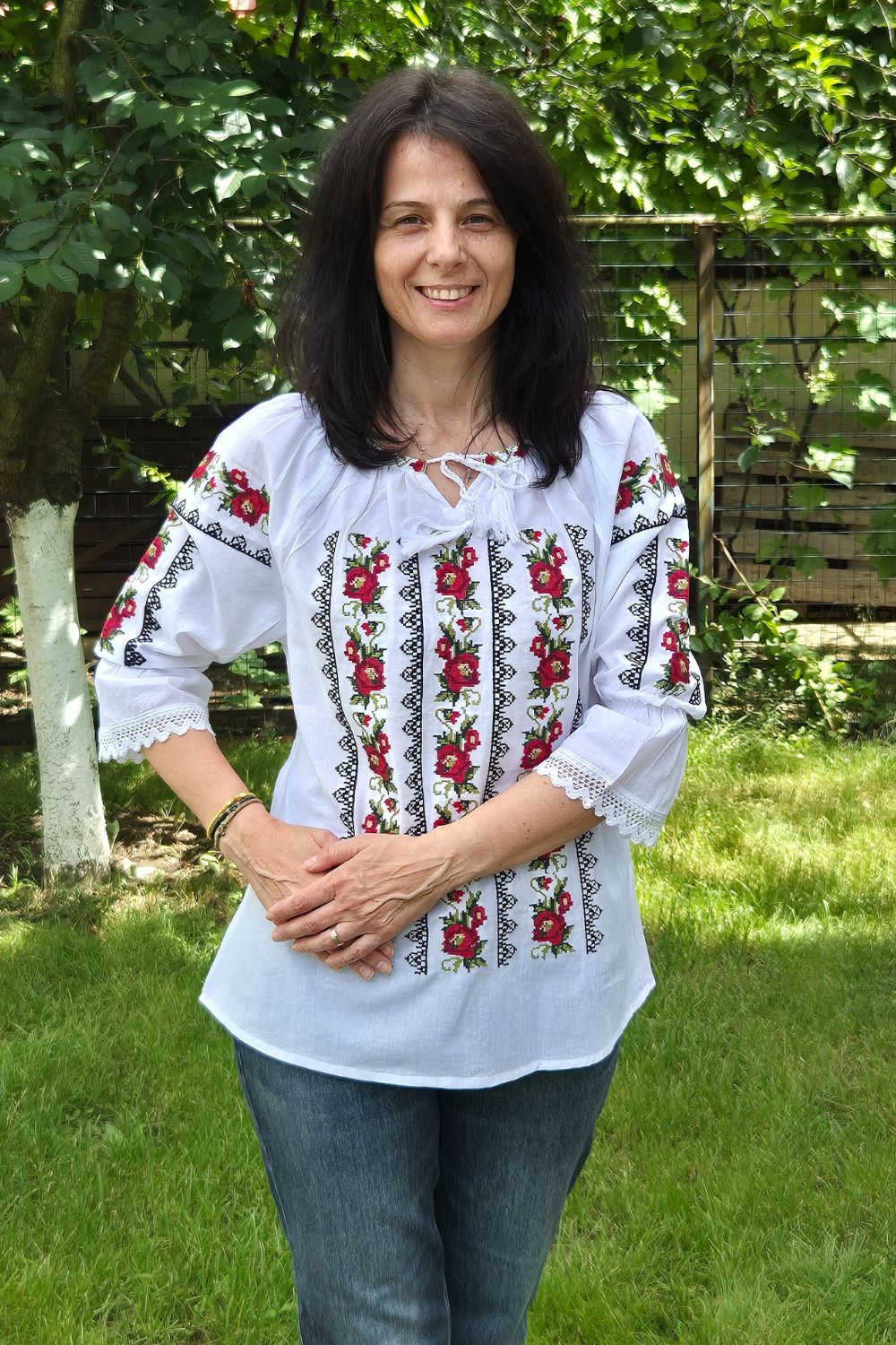 Materialul este panză de bumbac alba iar culoarea broderiei este rosie si verde . Mâneca este scurta