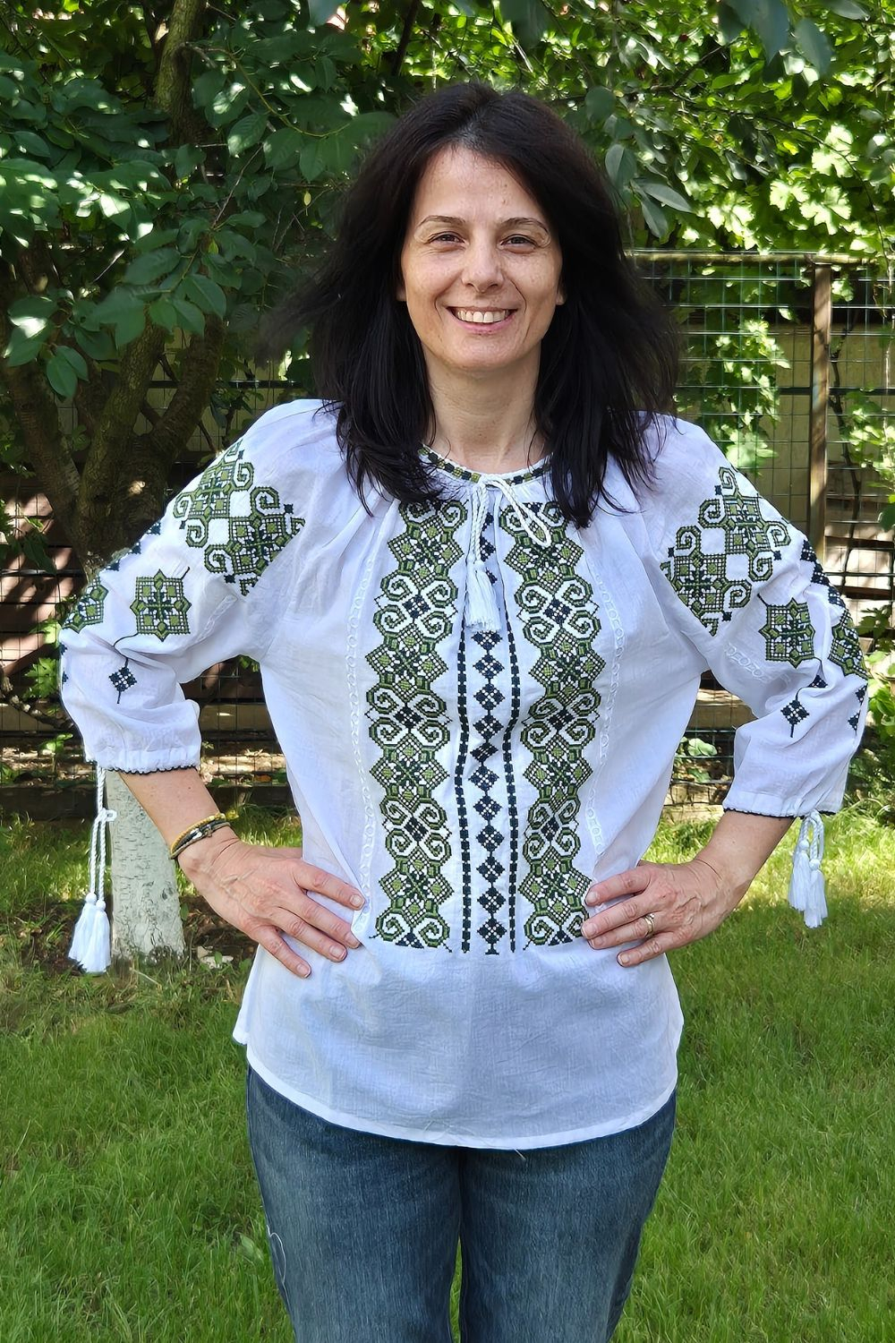 Materialul este panză de bumbac alba iar culoarea broderiei este verde. Mâneca este scurta