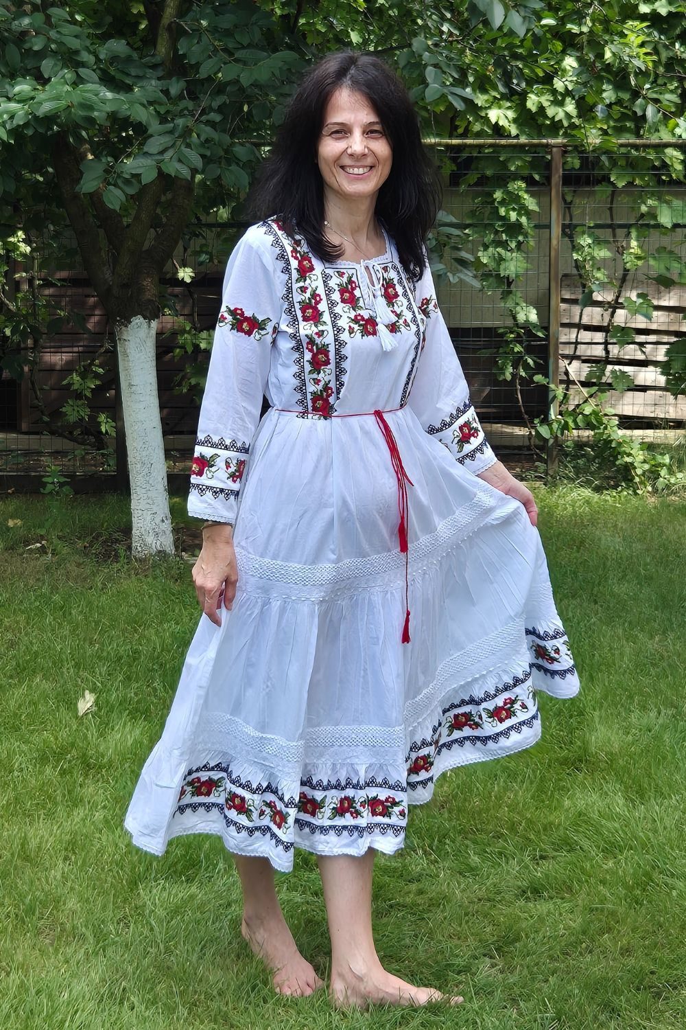 Rochie tradiţională damă brodată la maşină; material pânză de bumbac.Culoarea rochiei este alba iar broderia este multicolora.