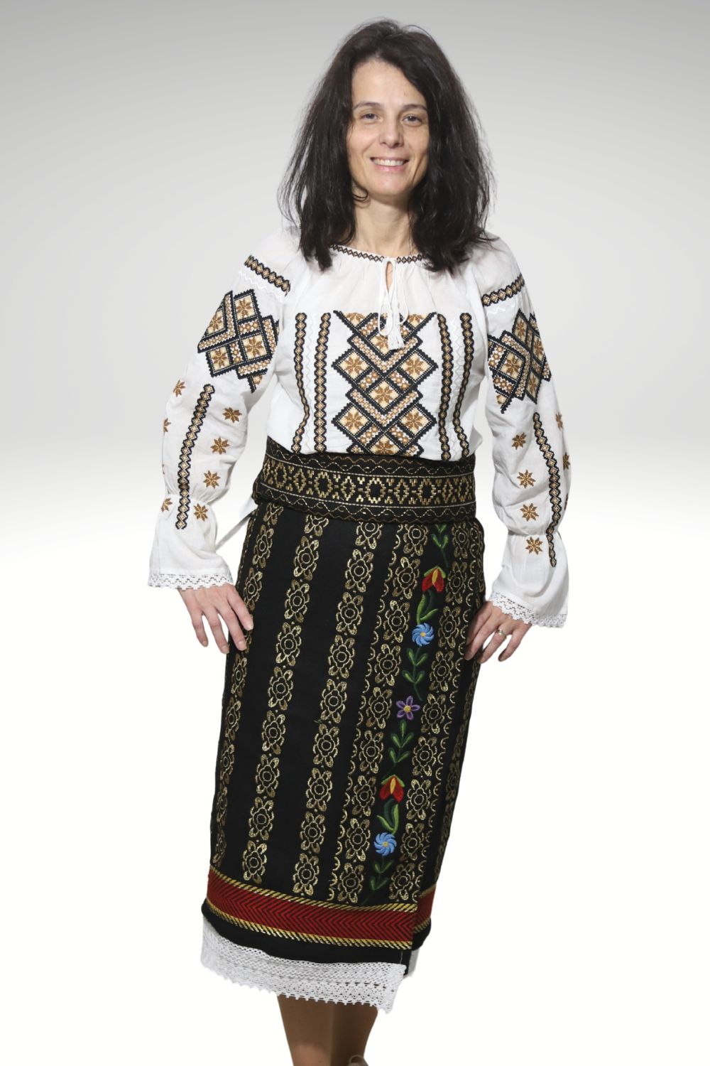 Catrinta in stil moldovenesc cu broderie si flori așezate vertical cu broderie aurie. În partea de jos este cusută pe catrință poalele de dantelă din bumbac care se vad in imagini.Catrința are in componența sa si brâul brodat in acelasi colorit si are o lungime de 244 cm si o lățime de 10cm. Dimensiunile catrintei sunt 157cm lățime si 85 cm înălțime.Este prevăzută cu sistem pe prindere pe interior pentru mai multe dimensiuni, fiind mărime universală.