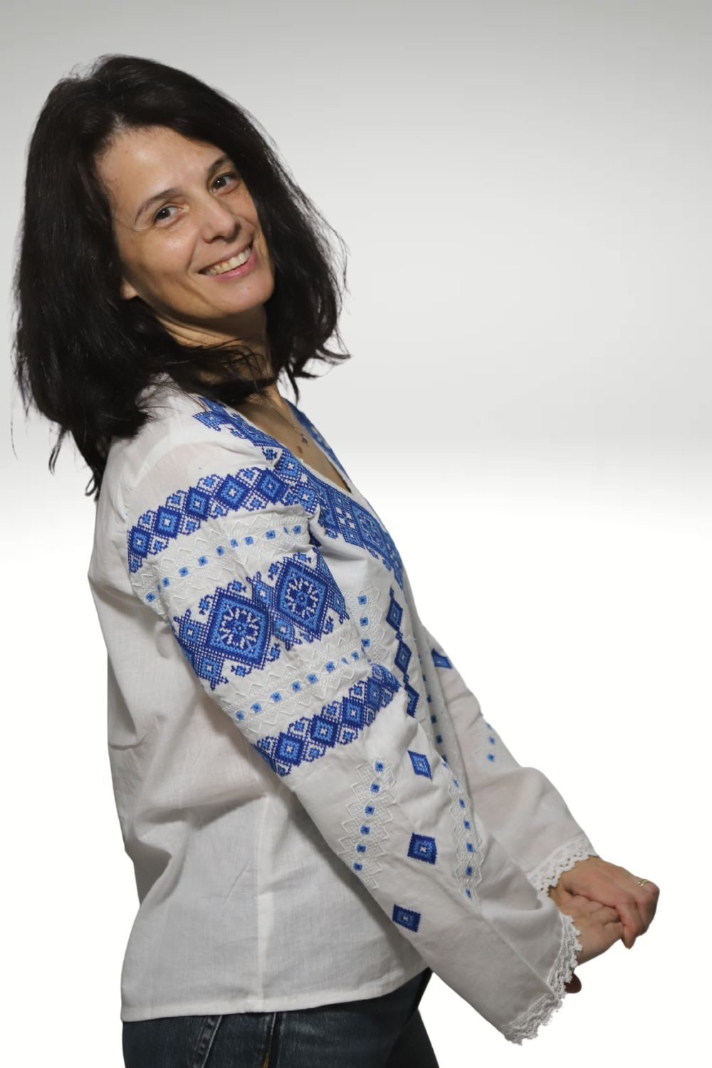 Materialul este panză de bumbac alba iar culoarea broderiei este albastra. Mâneca este lunga