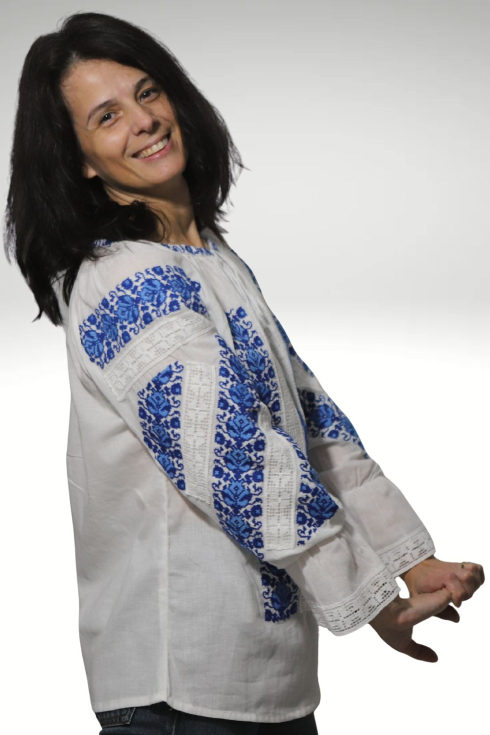 Materialul este panză de bumbac alba iar culoarea broderiei este albastra. Mâneca este lunga