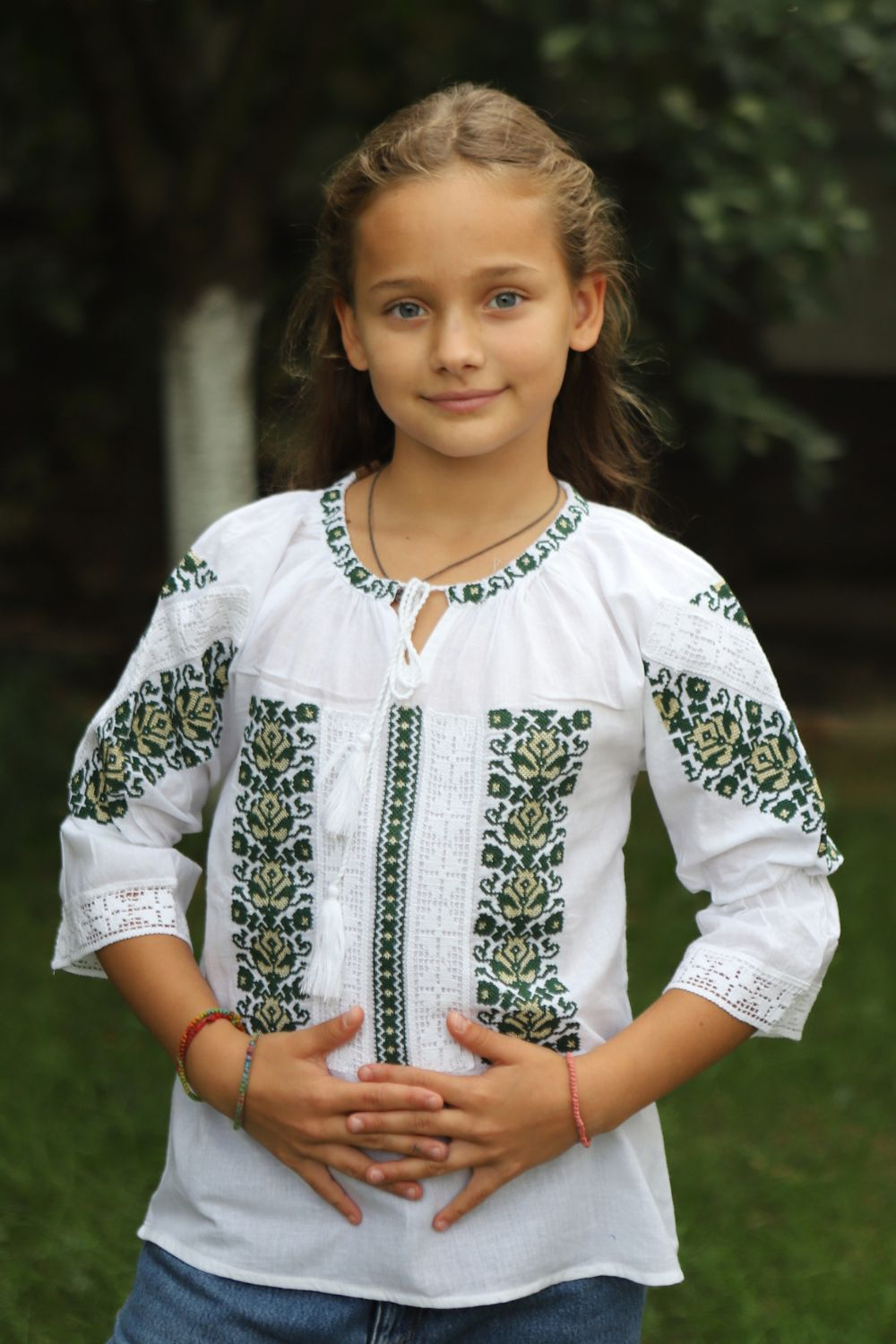 Ie tradiţională fete brodată la maşină;  culoarea broderiei este bej cu verde ; material pânză de bumbac.
