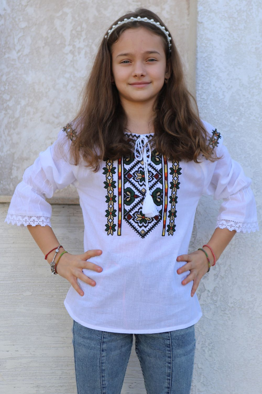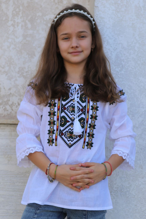 Ie tradiţională fete brodată la maşină;  culoarea broderiei este verde; material pânză de bumbac.