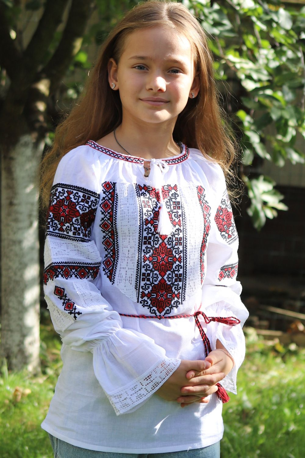Ie tradiţională fete brodată la maşină;  culoarea broderiei este rosie ; material pânză de bumbac.