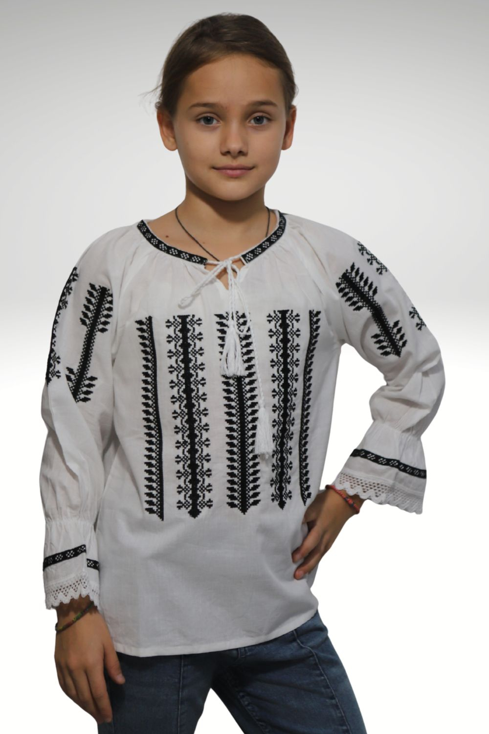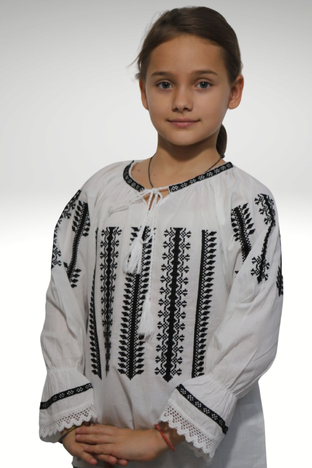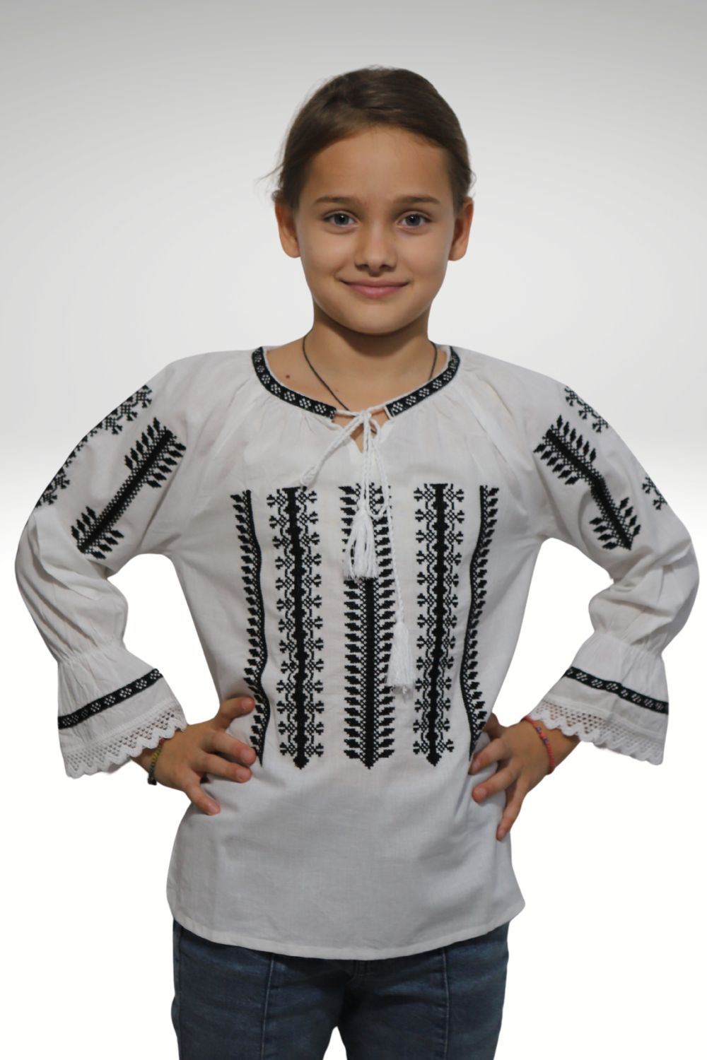 Ie tradiţională fete brodată la maşină;  culoarea broderiei este neagra ; material pânză de bumbac.