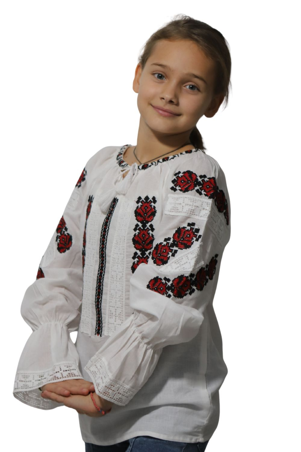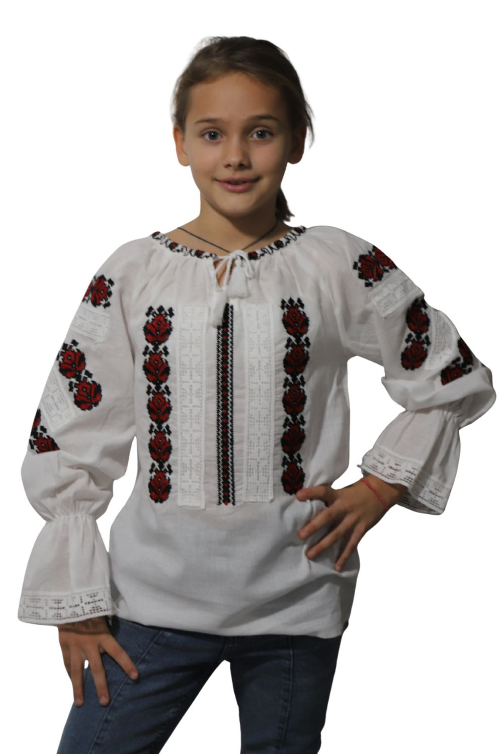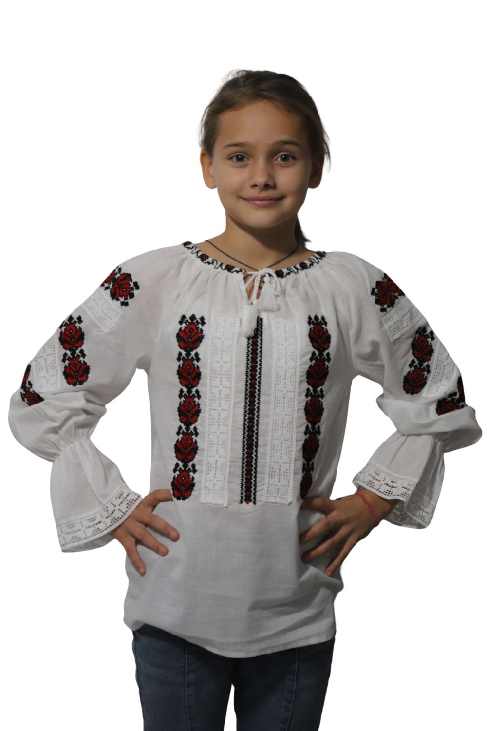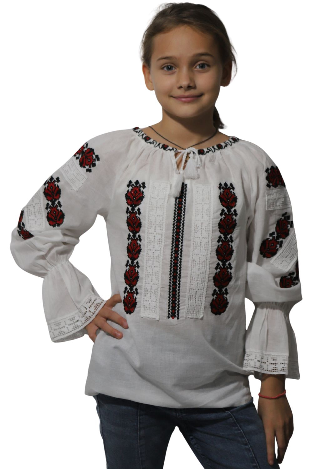 Ie tradiţională fete brodată la maşină;  culoarea broderiei este rosie ; material pânză de bumbac.