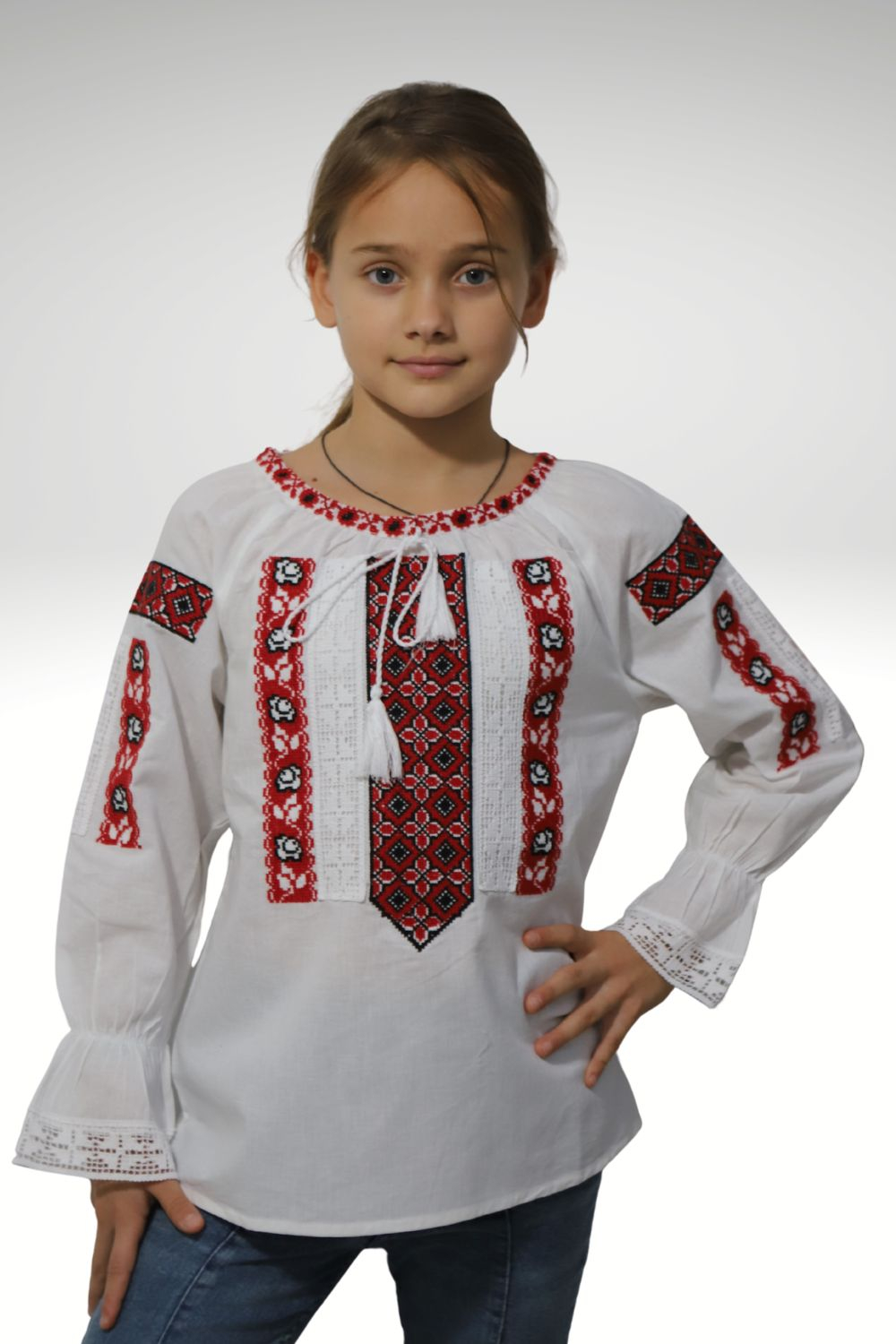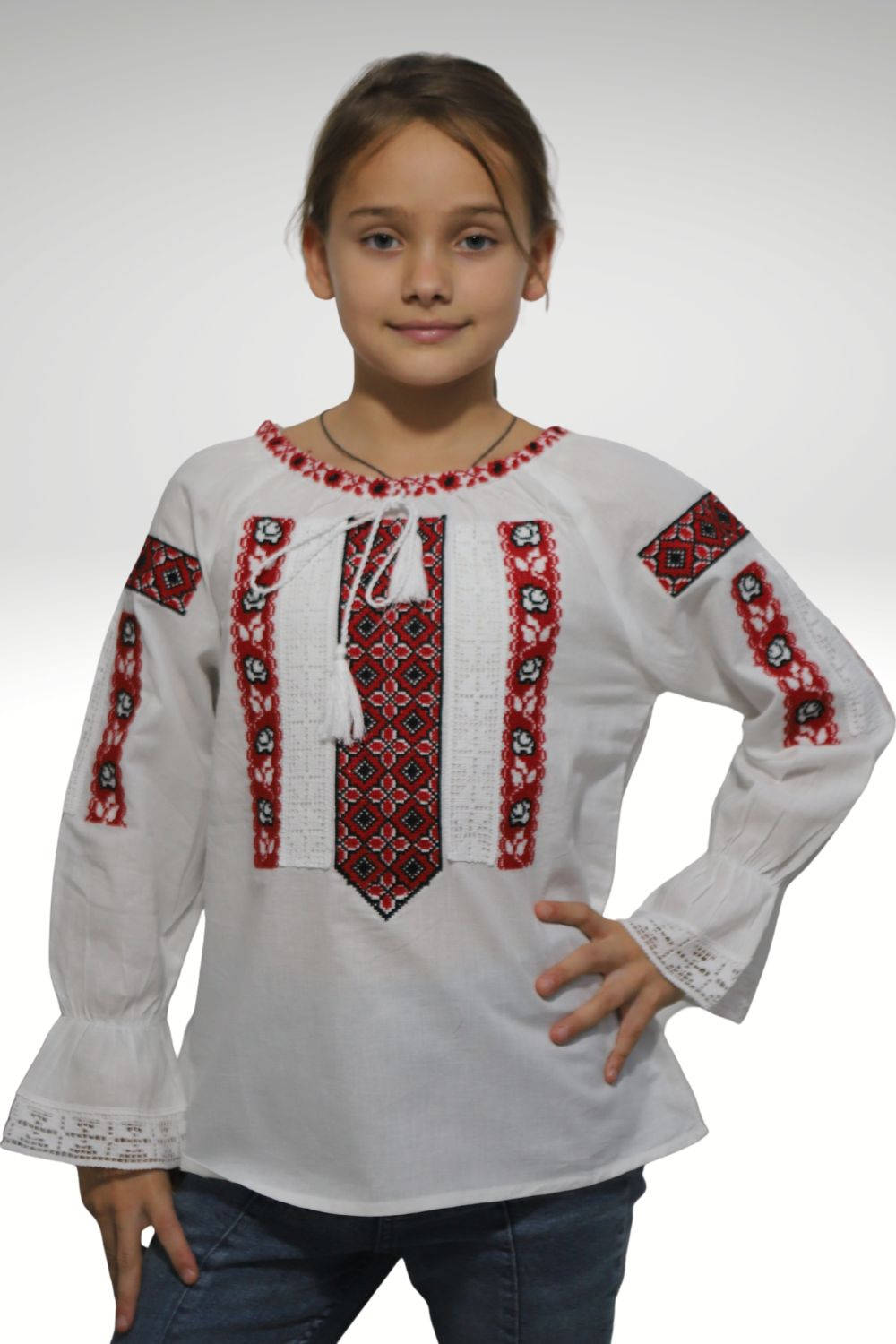 Ie tradiţională fete brodată la maşină;  culoarea broderiei este rosie; material pânză de bumbac.