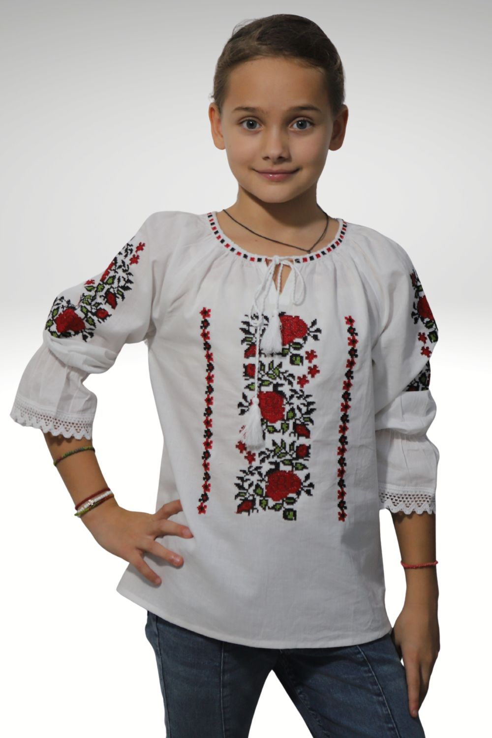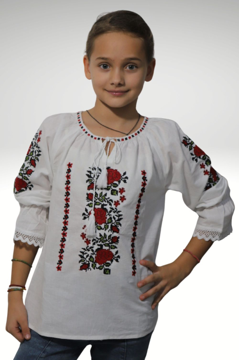 Ie tradiţională fete brodată la maşină;  culoarea broderiei este rosie; material pânză de bumbac.