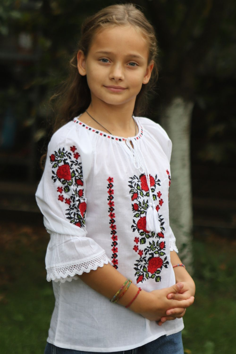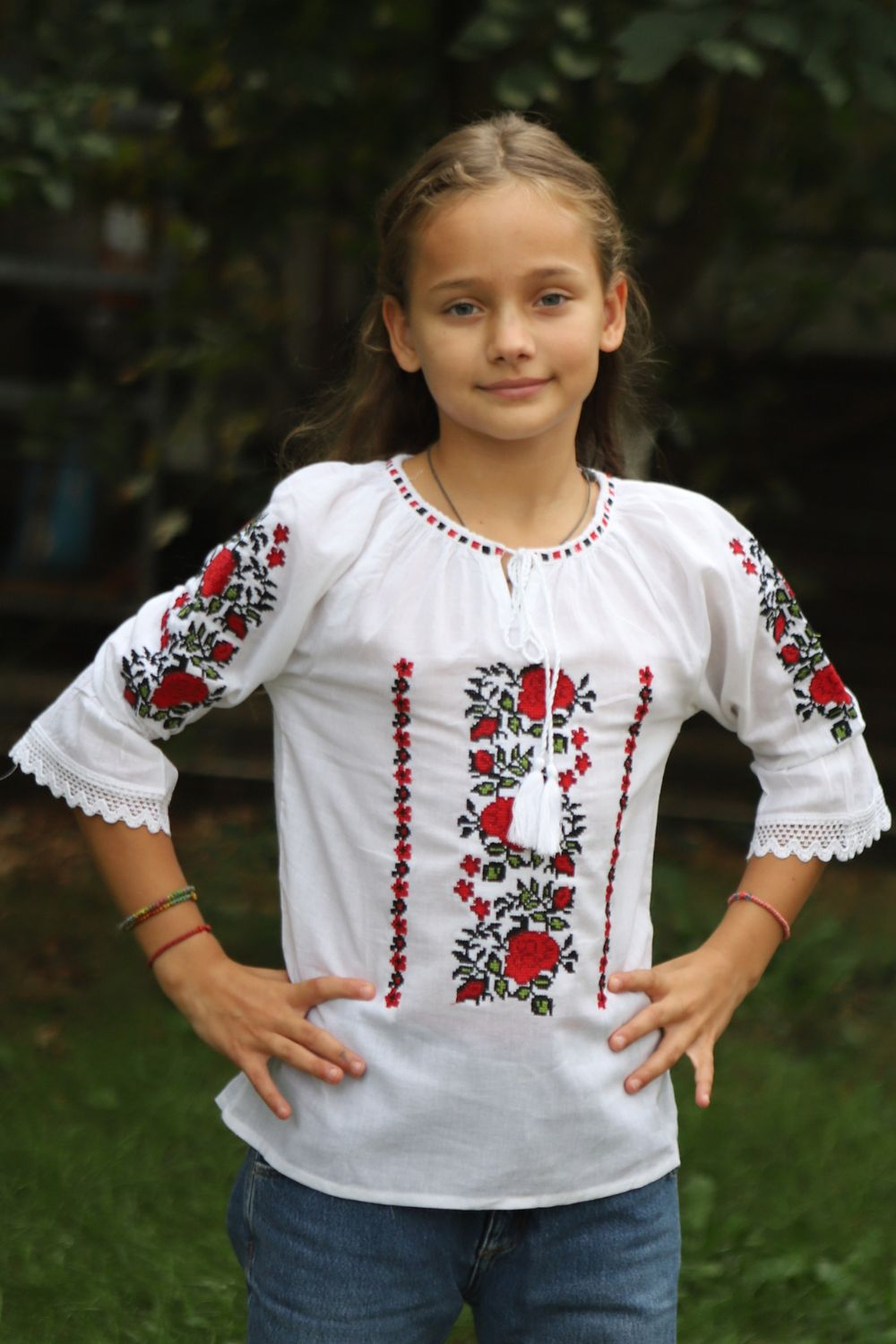Ie tradiţională fete brodată la maşină;  culoarea broderiei inflorata ; material pânză de bumbac.