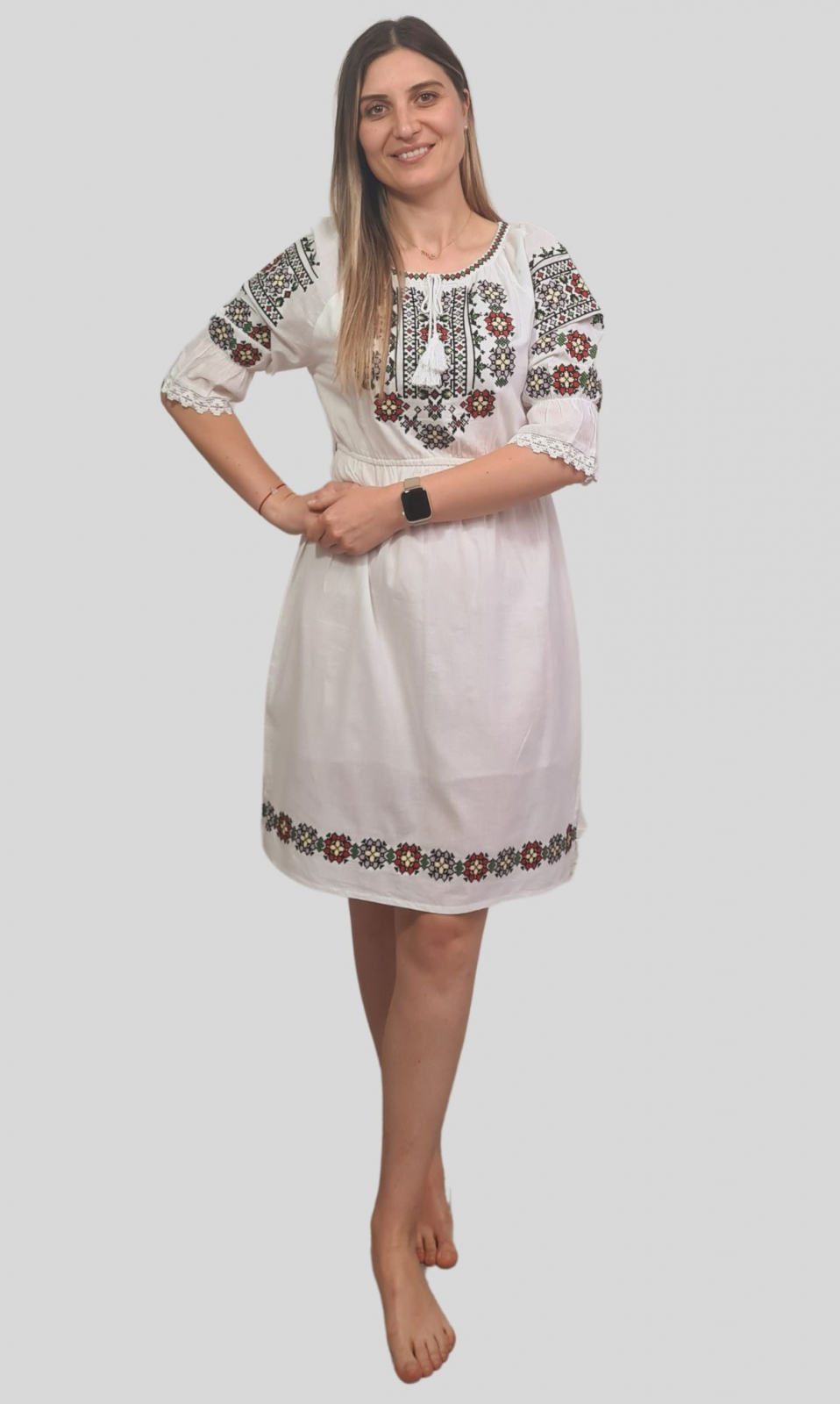 Rochia este dublată și are șiret elastic în talie. Culoarea rochiei este alba, iar broderia este multicolora.