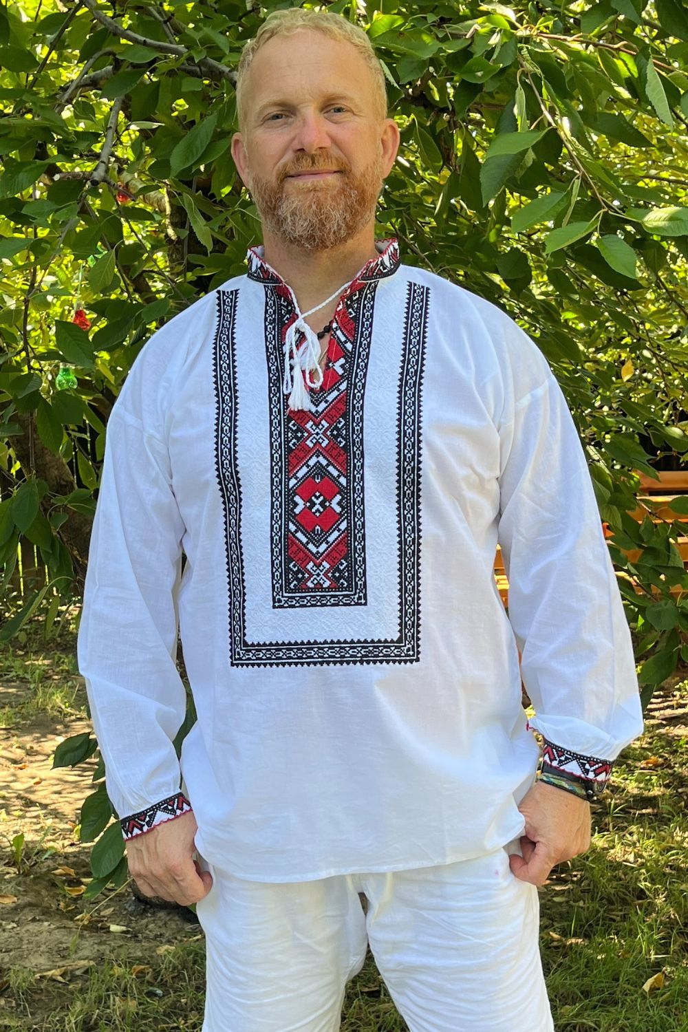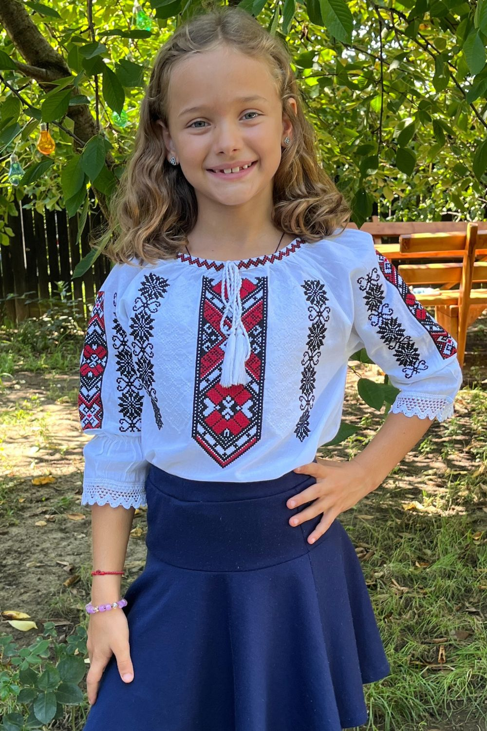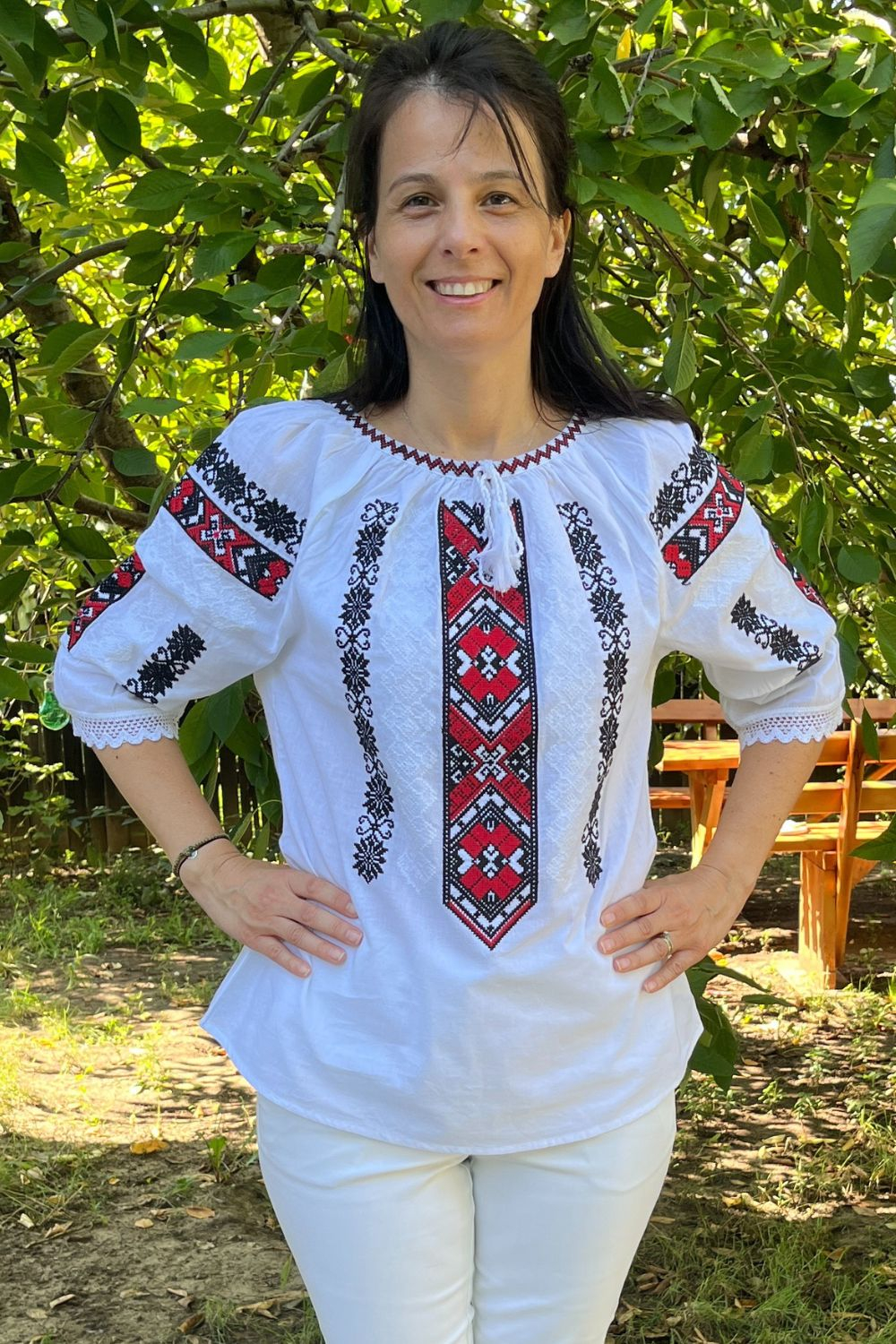 Broderia este rosie, este cusută automatizat, iar  materialul iilor este alb.