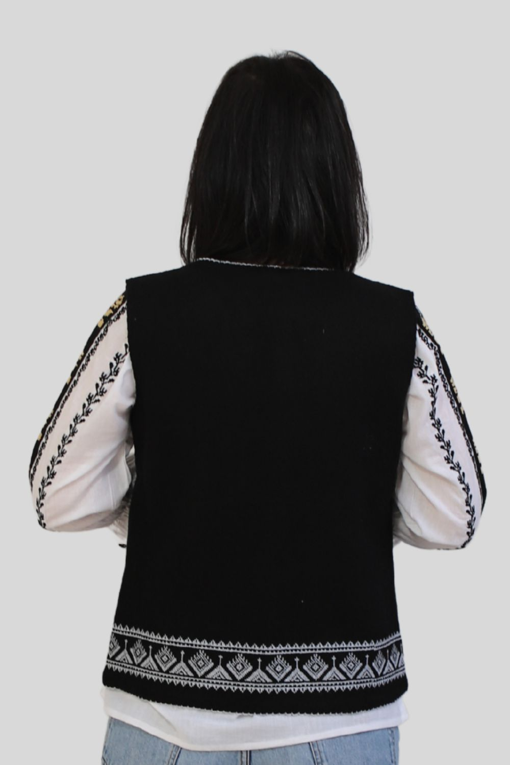 Vestă tradiţională damă brodată la maşină. Compoziția materialului este: lână 58%, polyester 25%, acrylic8%, nylon7%, viscoză1%, bumbac 1%. Culoarea vestei este neagră iar culoarea broderia este in nuante de galben,rosu si verde.
