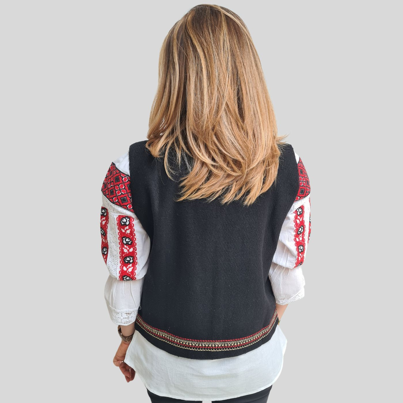 Vestă tradiţională damă brodată la maşină. Compoziția materialului este: lână 58%, polyester 25%, acrylic8%, nylon7%, viscoză1%, bumbac 1%. Culoarea vestei este neagră iar broderia este bej si grena.
